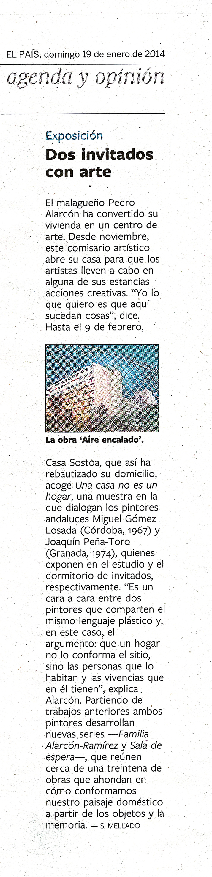 "Pedro Alarcón ha abierto su casa al mundo de forma temporal poniéndole al asunto mucho mimo y cuidando cada detalle (…) En esta ocasión, Miguel Gómez Losada (Córdoba, 1967) y Joaquín Peña-Toro (Granada, 1974) crean una muestra compuesta por pinturas procedentes de dos series independientes pero creadas “a partir de la filosofía del cara a cara”. Así, aún partiendo de la intimidad de los respectivos códigos, se procura que exista “una invisible hilazón que irá de uno a otro artista rescatando nuevas lecturas”.